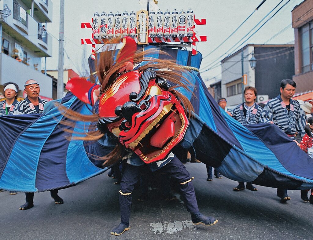 獅子頭の大きさは町内によって異なりますが、およそ幅50~60cm、重さは20kg前後です。小屋は標準で幅2m、奥行き5m、高さ2.5mあり、その中には囃子連が乗り、大太鼓・小太鼓・笛・鉦(しょう)で奏でます。曲は単純ですが、この囃子に合わせて幌を付けた獅子が舞う姿は実に勇壮です。